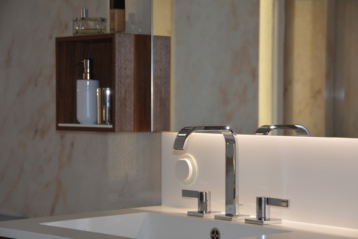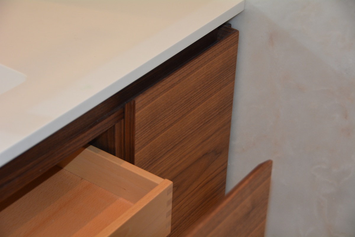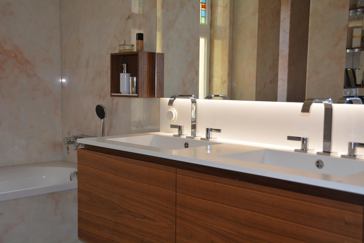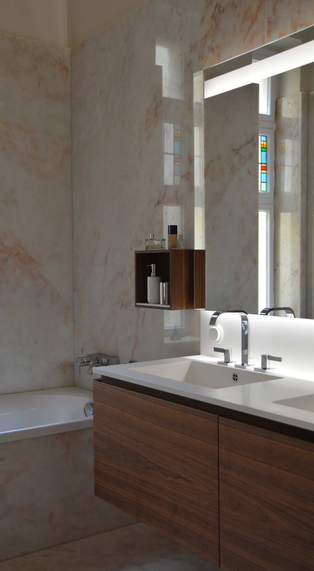 Neugestaltung eines Marmorbades in einer Berliner Altbauetage. Der vorhandene portugiesische Marmor an Wänden und Decken sollte bei der Neugestaltung erhalten bleiben. Der neue Waschtisch wurde nach Architektenplänen maßgefertigt. Die Ablageplatte und die bündig eingelassenen Waschbecken bestehen aus Corian, die Holzfronten und die Ablagekästen aus amerikanischem Nussbaum. Das Innenleben der Auszüge wurde mit verschiebbaren Ablagen aus Buche gefertigt.